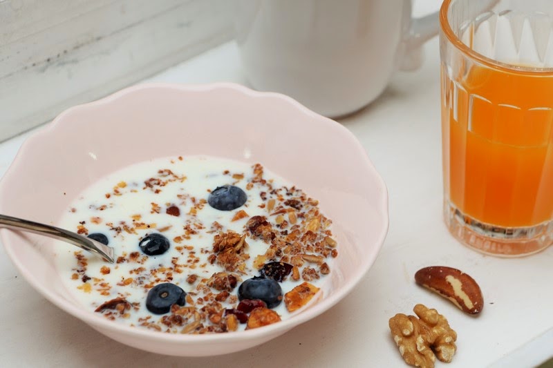 Im Original Rezept sind noch Rosinen und dafür keine Paranüsse enthalten. Aber ich hasse Rosinen und veranstalte grundsätzlich ein Schlachtfeld auf meinem Teller, sollten im Kuchen Rosinen sein. Aber wenn Ihr Rosinen mögt, dann die natürlich auch noch mit hinein ins Granola. Paranüsse mag ich besonders, deswegen hab ich anstatt der Rosinen einfach ein paar davon mit rein gemischt. In der Beziehung könnt Ihr euch ja auch komplett austoben.